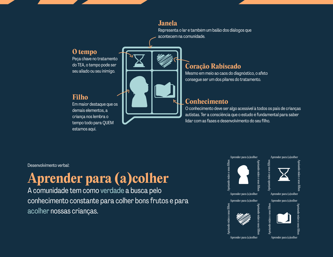 O conceito da marca surgiu a partir do local onde o tratamento é mais eficaz: o lar. Por meio de entrevistas com mães de crianças autistas e do entendimento do Dr. Thiago Castro, pude expressar a essência da comunidade por meio de um símbolo que une o lar, o tempo essencial para o tratamento, o afeto que, mesmo caótico, é o elo que une uma família – e, por fim, o conhecimento científico, pilar para boas escolhas. Todos esses elementos estão representados dentro de uma janela, que também é um balão de diálogo, simbolizando os diálogos presentes na comunidade.